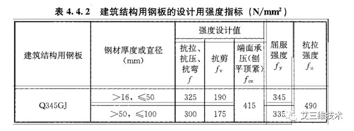 2.建筑结构用钢板的设计用强度指标,可根据钢材牌号厚度或直径按下表采用。